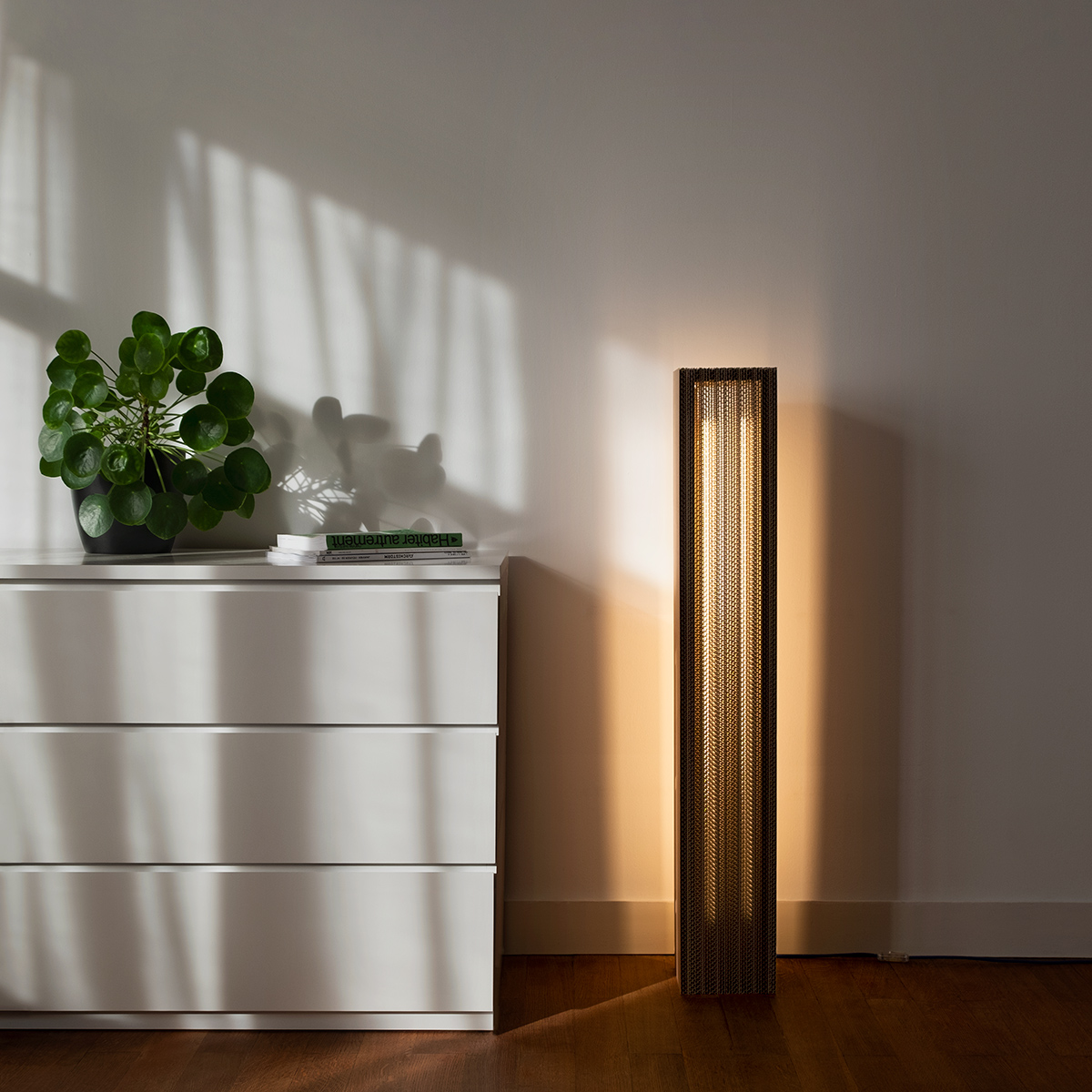 Made from recycled cardboard, these lights combine raw lines, soft light, and colorful interchangeable cables offering a playful and evolving approach to lighting.