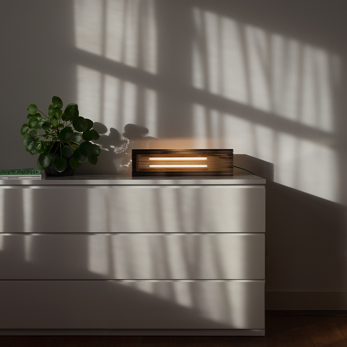 Réalisés en carton recyclé, ces luminaires associent lignes brutes, lumière douce et câbles colorés interchangeables pour une approche ludique et évolutive de l’objet.
